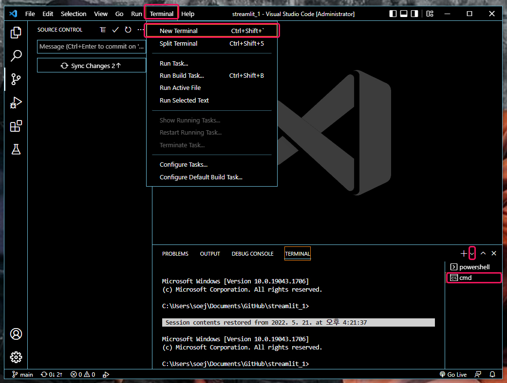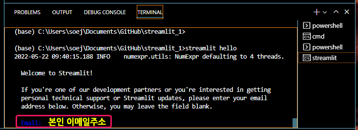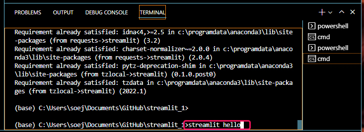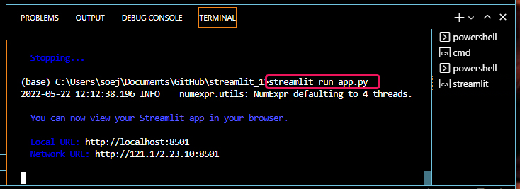 | 비주얼 스튜디오 코드의 터미널을 이용해서 스트림릿 실행하는 방법 (0) | 2022.05.19 |