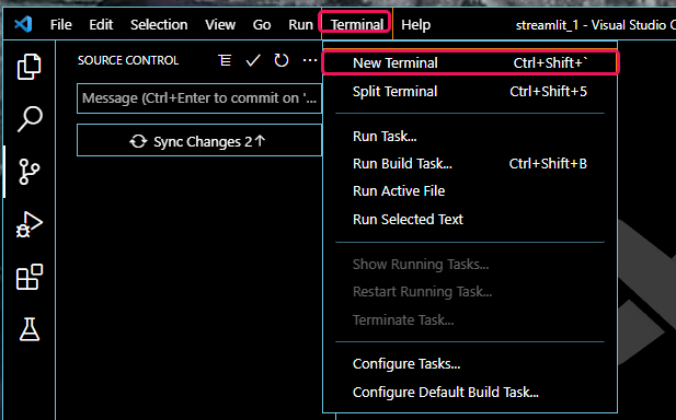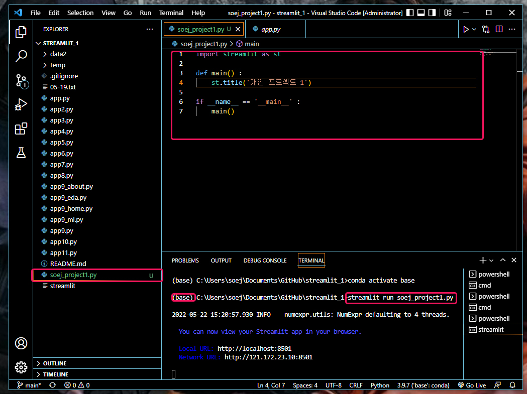 비주얼 스튜디오 코드의 터미널을 이용해서 스트림릿 실행하는 방법