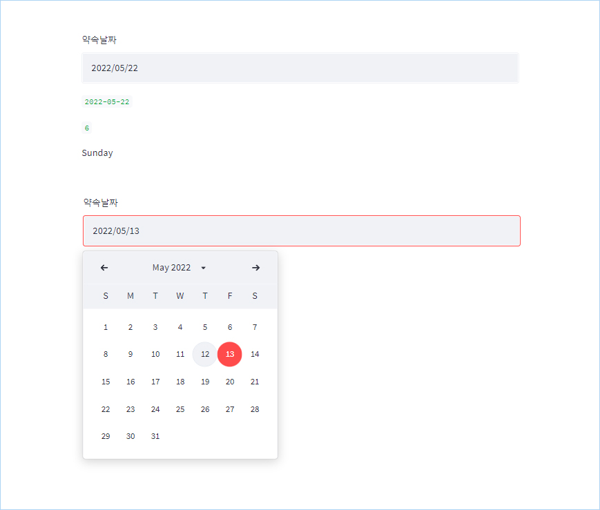 my_date = st.date_input('약속날짜') # 디폴트로 오늘 날짜가 찍혀 있다.