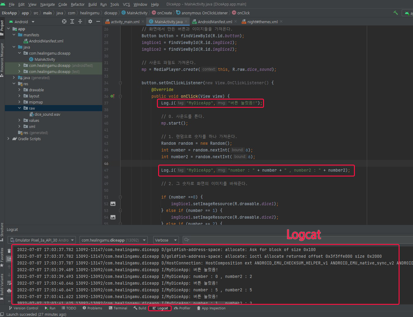 Log.i("MyDiceApp","버튼 눌렀음!");