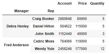 pd.pivot_table(df, index=[ 'Manager', 'Rep' ], aggfunc=np.sum)