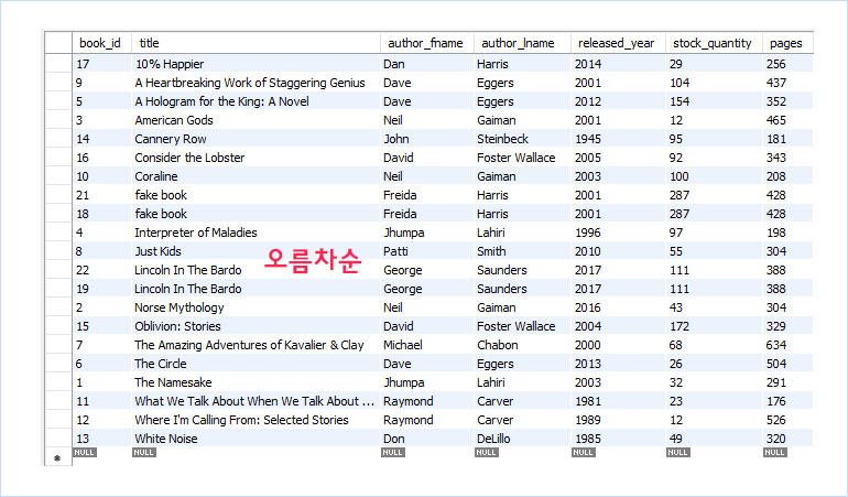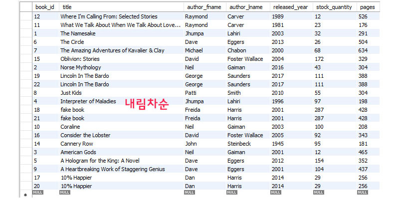 그 컬럼명과 다른 컬럼명으로 내림차순 정렬