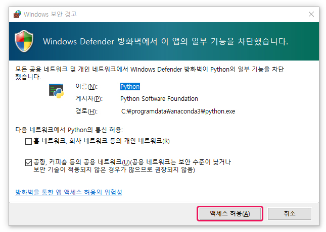 액세스 허용으로 해제해 줍니다.