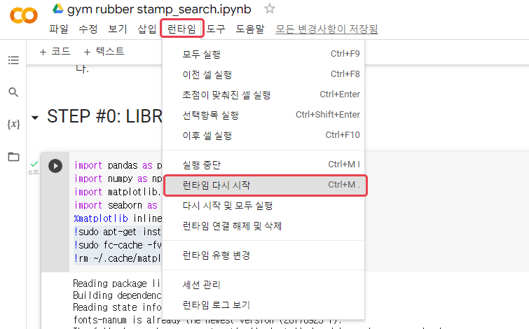 코랩에서 [런타임] → [런타입 다시 시작]을
