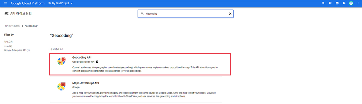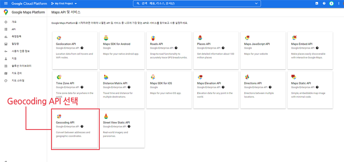 Geocoding API를 선택합니다.