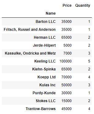 pd.pivot_table(df, index=[ 'Name' ], values=[ 'Price', 'Quantity'], aggfunc=np.sum) |